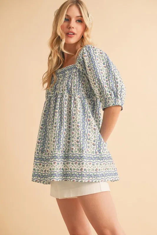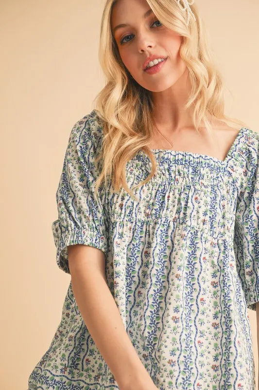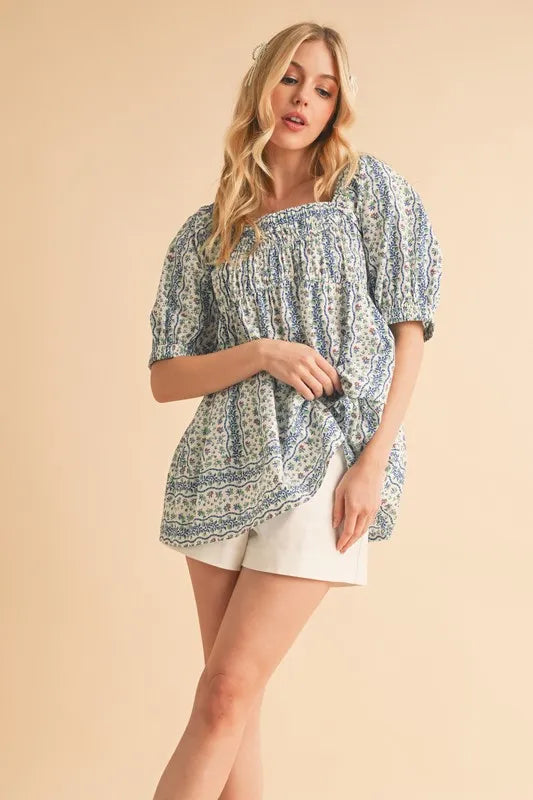 And The Why Ruffled Neck Tied Strap Boho Printed Swing Top And The Why Ruffled Neck Tied Strap Boho Printed Swing Top