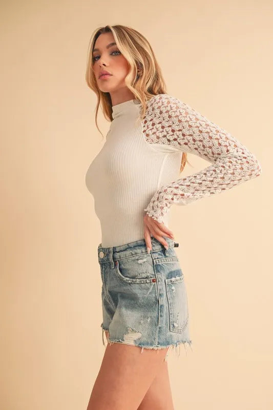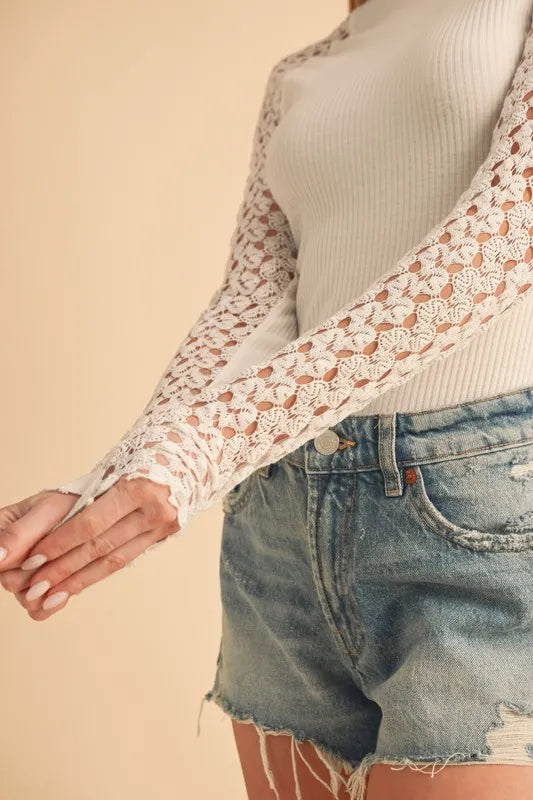 Aemi+Co Mock Neck Ribbed Knit Top with Crochet Sleeve Aemi+Co Mock Neck Ribbed Knit Top with Crochet Sleeve